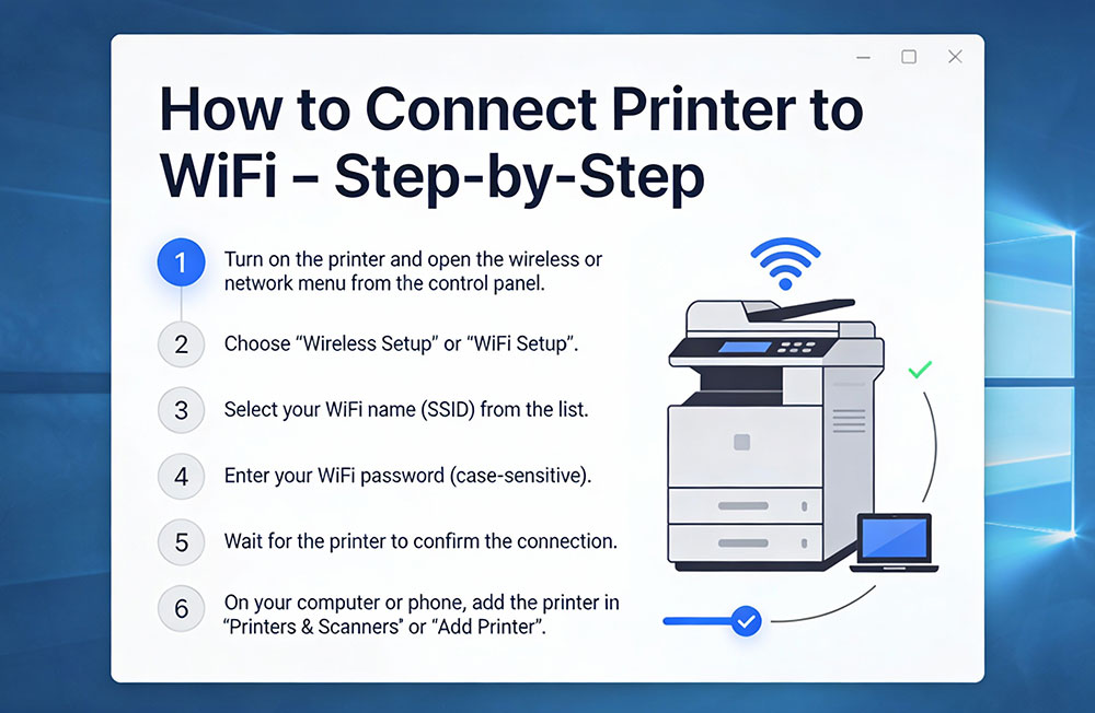If you are searching for how to connect my printer, struggling with a printer offline issue, or trying to set up a wireless printer, this step-by-step guide will help you complete your printer setup quickly and safely. These instructions are manufacturer-neutral, easy to follow, and created for users looking to connect a printer to Wi-Fi, fix printer scanner setup issues, and troubleshoot common errors like printer not connecting to WiFi or printer paper jam.